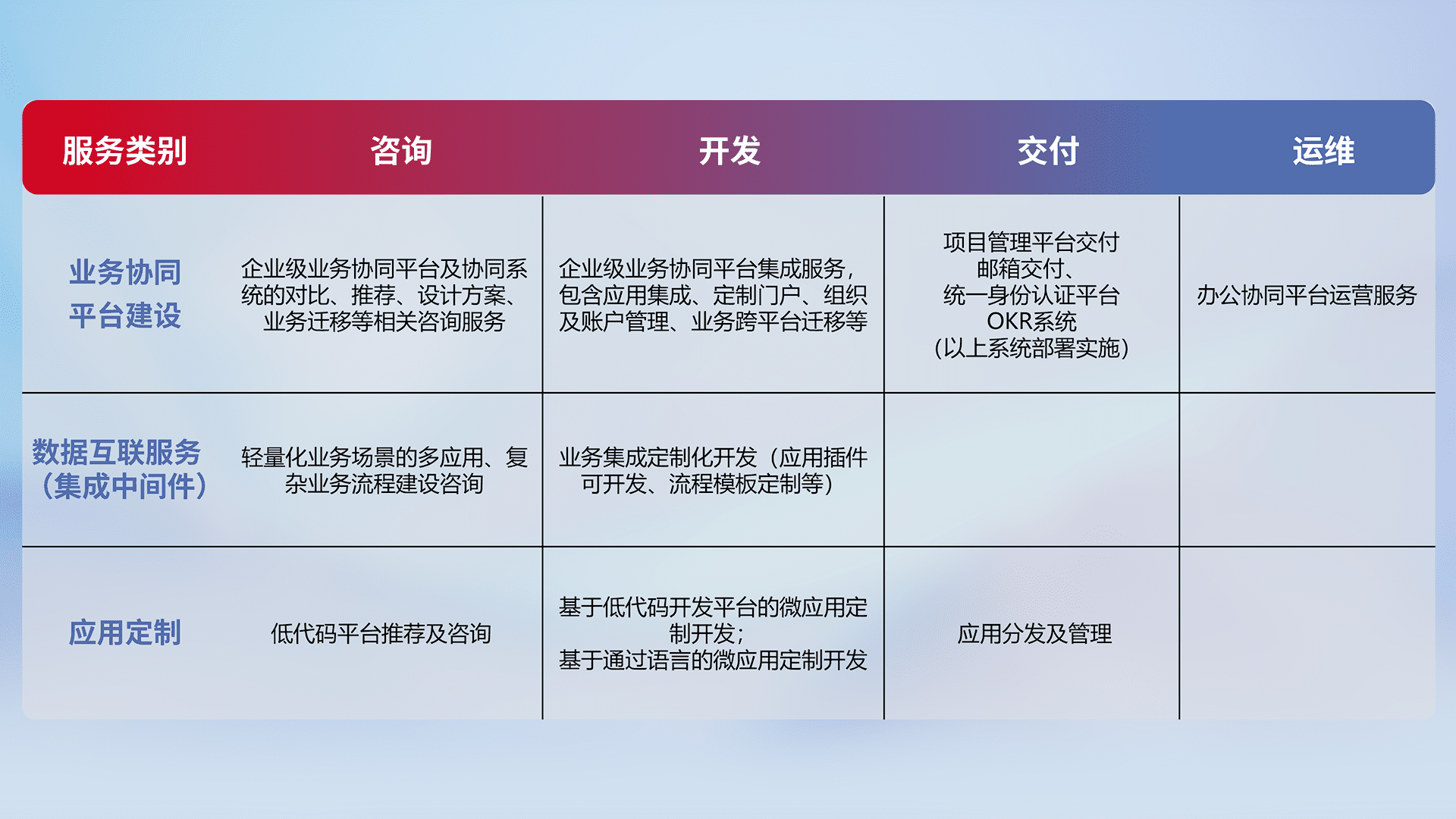 针对钉钉、、、企微、、、、IDaas等平台级产品提供产品的规划、、、、方案、、交付、、、、定制化开发等服务,,实现如统一协同办公、、、智能客户服务、、混合会议管理、、、、智能数据查询、、等业务场景,,,实现数字化转型。。。